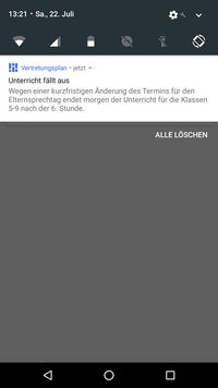 Neben den automatischen Benachrichtigungen über Änderungen am Vertretungsplan können Schulen wichtige Ankündigungen nun auch direkt als Textnachricht per Push-Benachrichtigung an alle Nutzer der App an der jeweiligen Schule schicken. Mit diesem neuen Kommunikationsweg können alle Schüler, Eltern und Lehrer, die die App benutzen, innerhalb weniger Minuten erreicht werden. Diese Funktion ist gegen Aufpreis für Kunden der Schullizenz verfügbar, das entsprechende Webinterface zum Senden der Nachrichten kann ab Beginn des nächsten Schuljahres freigeschaltet werden.